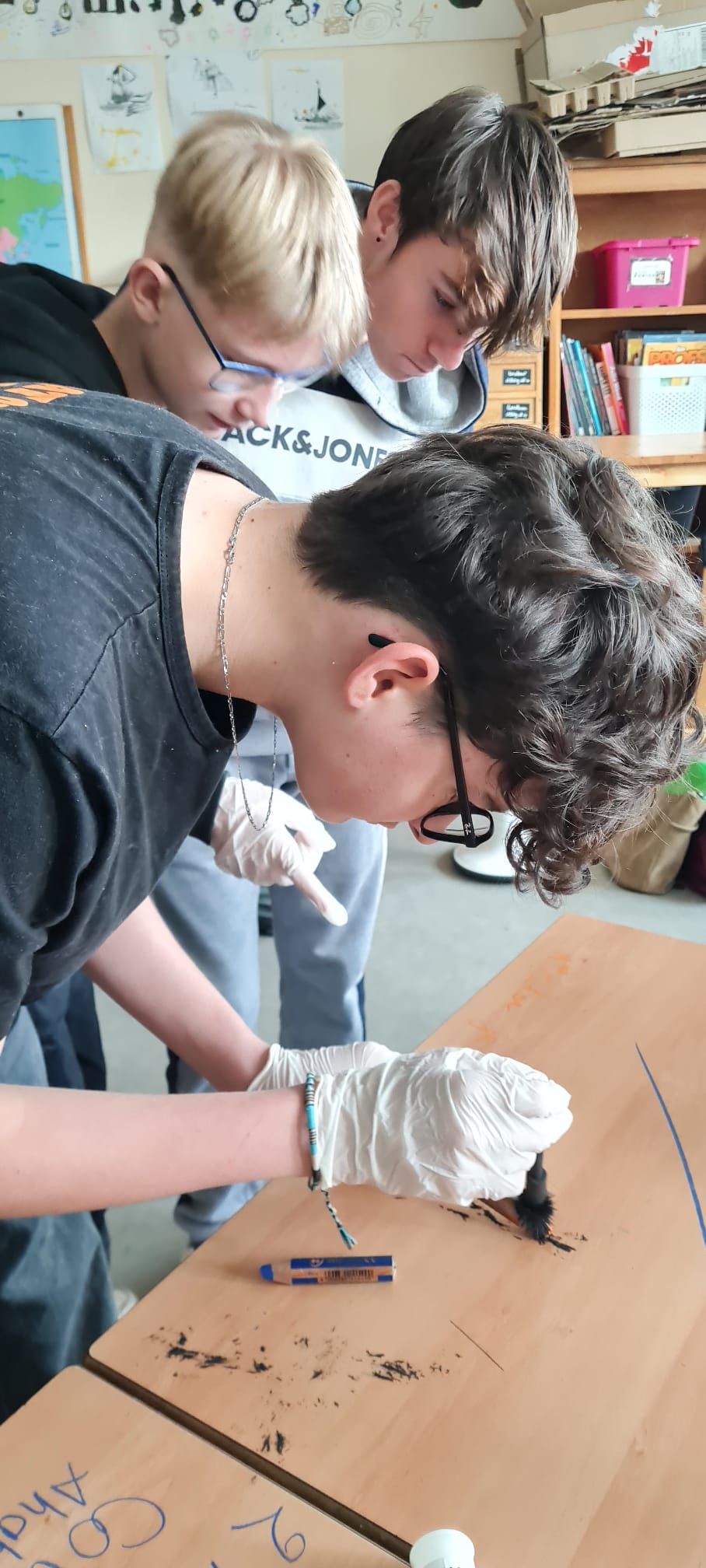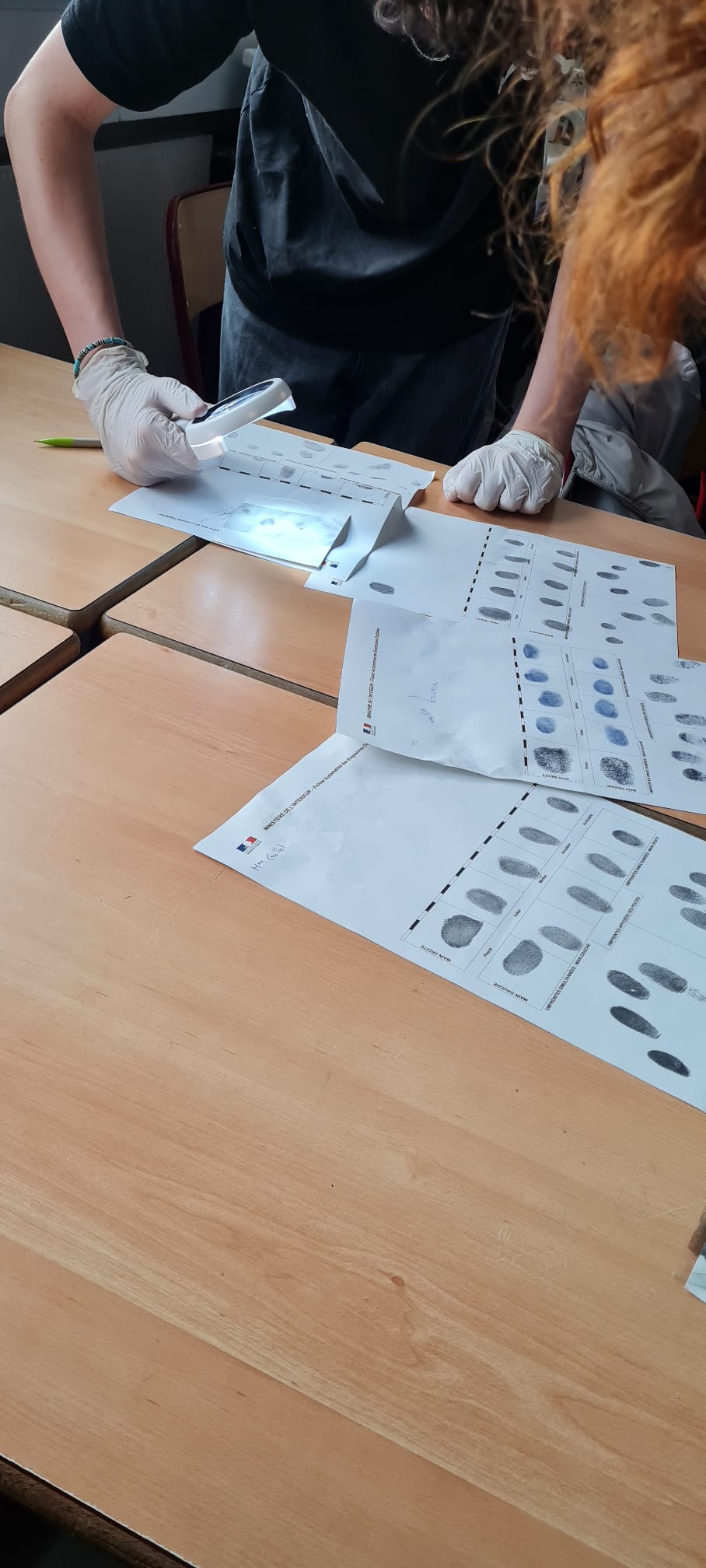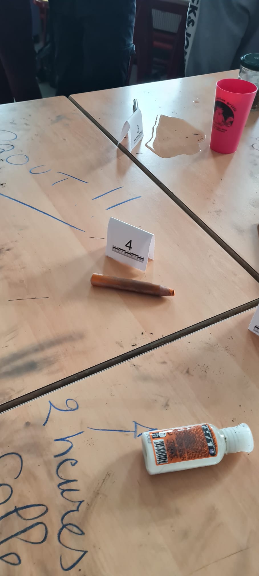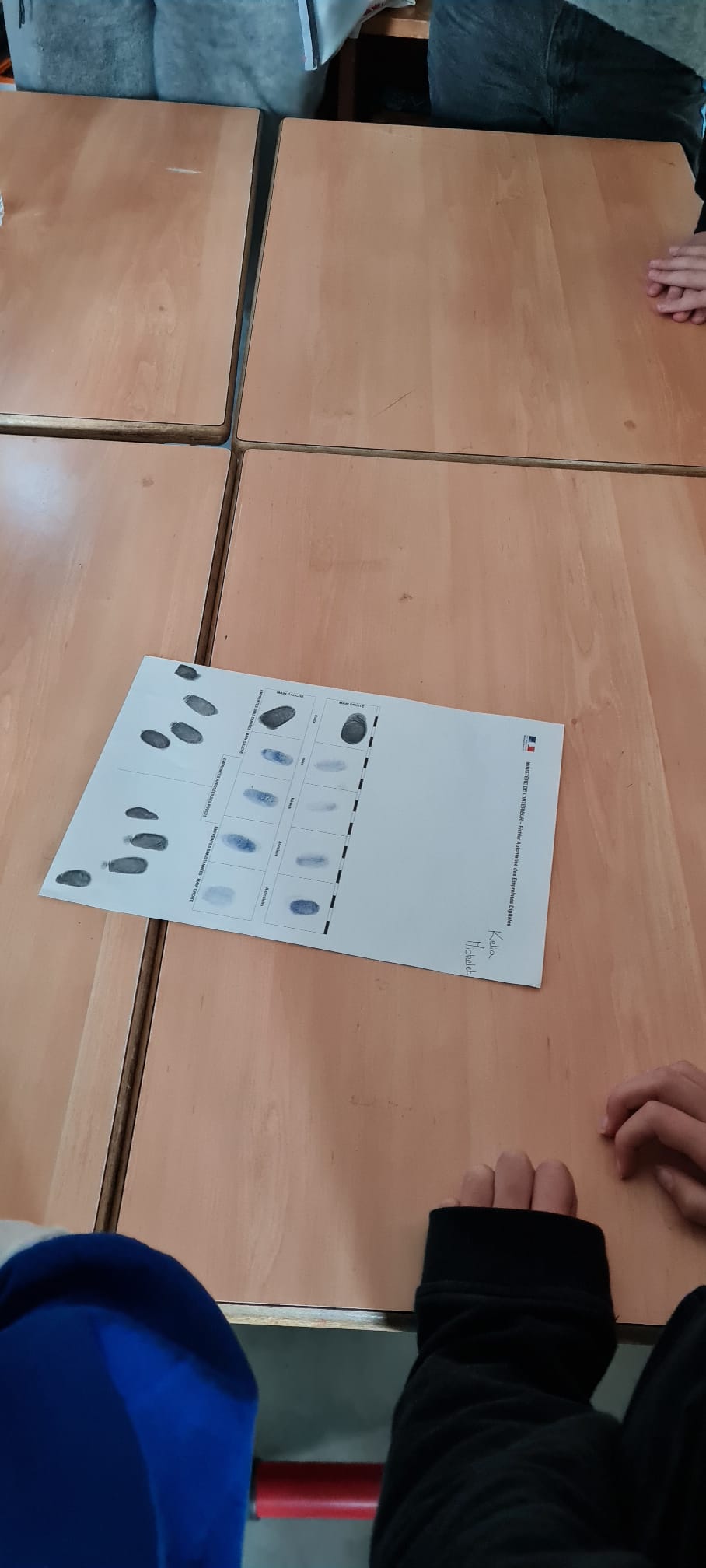 Lundi 4 Novembre, au retour de la récréation, les 4eA ont trouvé la salle dans un état déplorable : crayons et coussins éparpillés, inscriptions déplacées au tableau ou sur les tables, verre d’eau renversé… Mais que s’est-il donc passé ? Les élèves ont mené l’enquête : recherche d’indices, témoignages, liste de suspects, prélèvement d’empreintes sur les objets et relevé de celles des suspects… trouveront-ils le ou les coupables ?